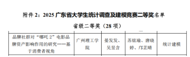 由苏炫瑜、唐晓婷、邝芷晴同学完成的课题《品牌社群对“哪吒2”电影品牌钞票影响作用的策划——基于蹧蹋者视角》荣获省二等奖。该策划荟萃蹧蹋者活动表面与统计建模,深远推敲了品牌社群对电影IP价值的影响机制,为文化产业的品牌修复提供了数据撑持。