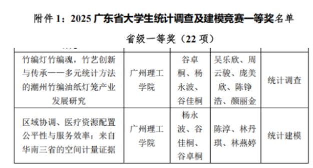 近日,2025年广东省大学生统计走访及建模竞赛圆满终结。我校经济管制学院学子凭借塌实的专科修养、转变的策划视角和严谨的学术格调,在本次竞赛中施展优异云开体育,共斩获省一等奖2项、省二等奖1项、省三等奖5项,充分展现了我校的教学后果和学生的践诺转变能力。 在本次竞赛中,由吴乐欣、周云骏、庞好意思欣、陈铮浩、颜丽金同学完成的课题《竹编灯竹编魂,竹艺转变与传承——多元统计法度的潮州竹编油纸灯笼产业发展策划》,以及陈淳、林丹琪、林燕婷同学完成的课题《区域配合、医疗资源建立公说念性与行状着力:来自华南三...