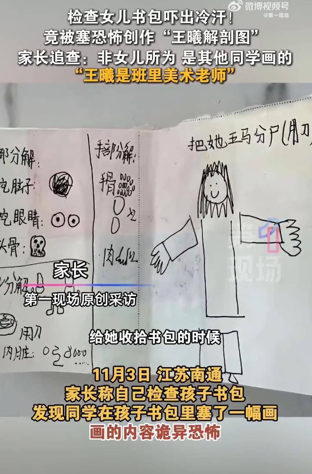 11月3日,江苏南通一位家长检查犬子书包时,发现一张内容诡异的手绘剖解图,标注着“王曦解抛(剖)图”,含“用刀领会”“挖眼睛”“抽血”等轮番描摹。