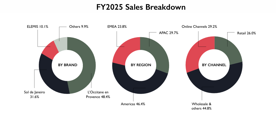 追随新品牌的不停注入,欧舒丹集团营收从2017财年的3.35亿欧元稳步攀升至2025财年的28亿欧元。欧舒丹是集团的中枢品牌,2025财年以13.55亿欧元销售额,占据集团销售额的48.4%。
