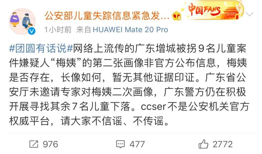 关联词,即使是全能的互联网,也没能找到梅姨的下降。反而是这张像片,很快就被公安部的官方微博辟谣了: