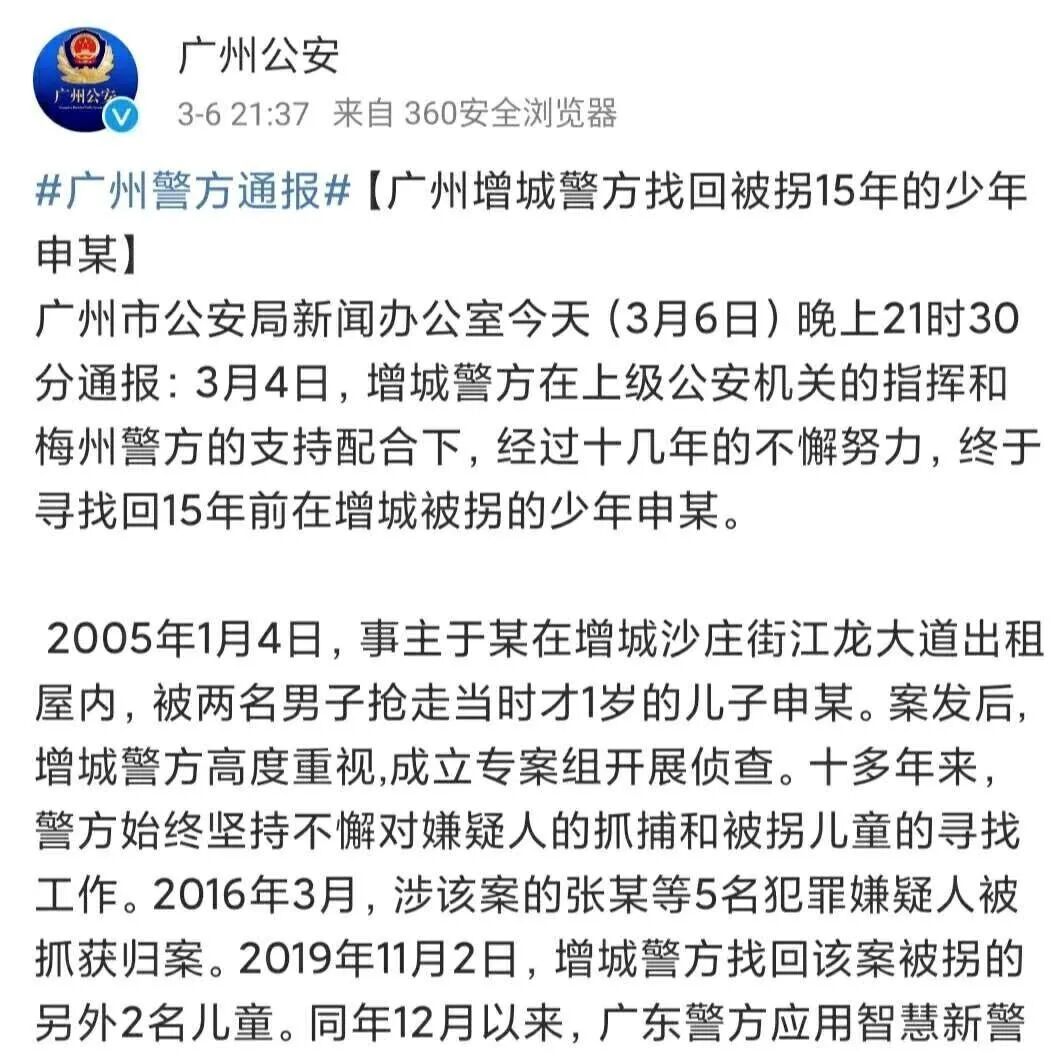 2020年3月,被拐卖仍是15年的申聪被找到,与家东说念主重新团员。