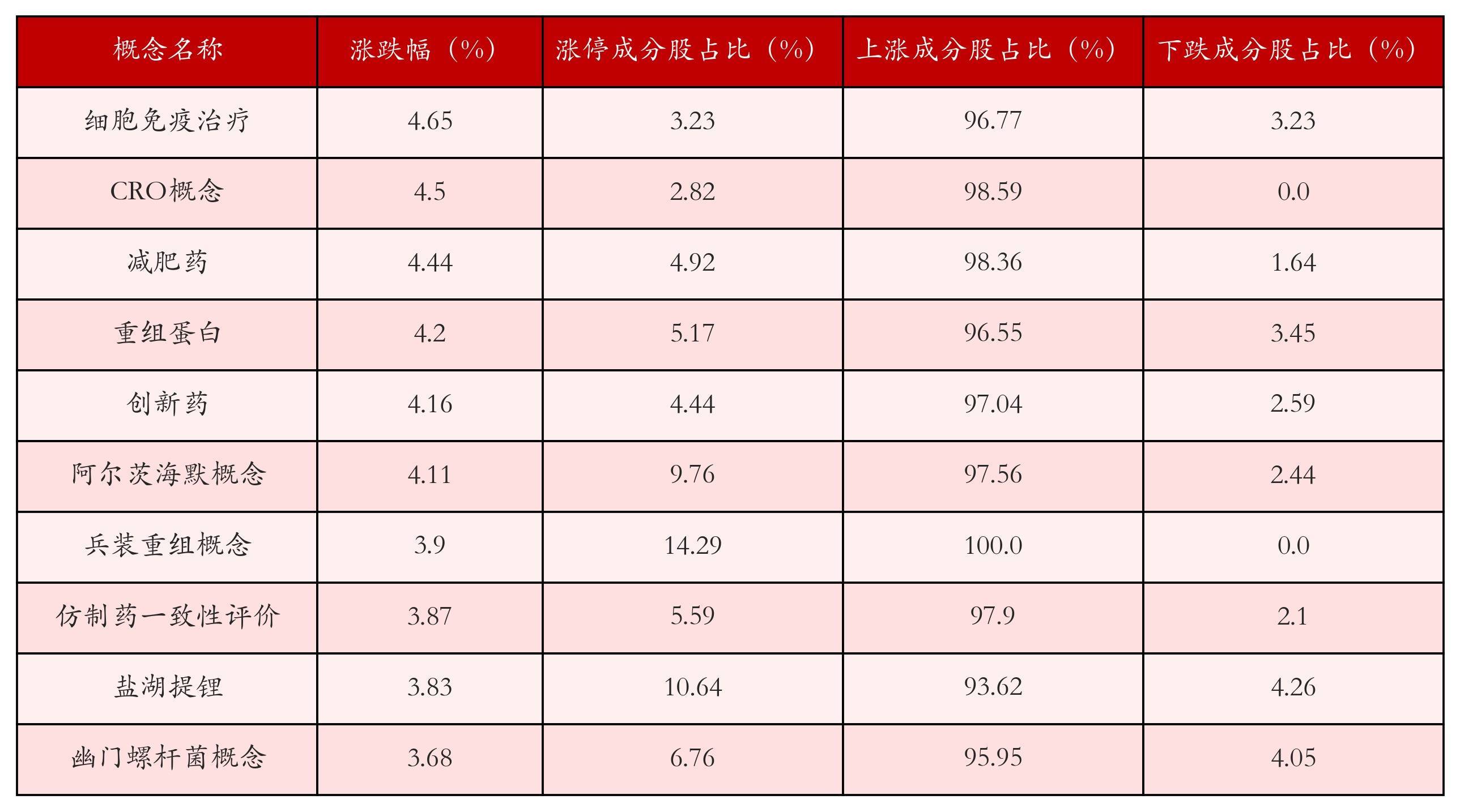 左证A股观点涨跌幅与所对应的股票池详细分析,涨幅靠前的三个观点板块分辩为:细胞免疫诊疗、CRO观点与减肥药。名次前10位的观点板块有关数据见下表: