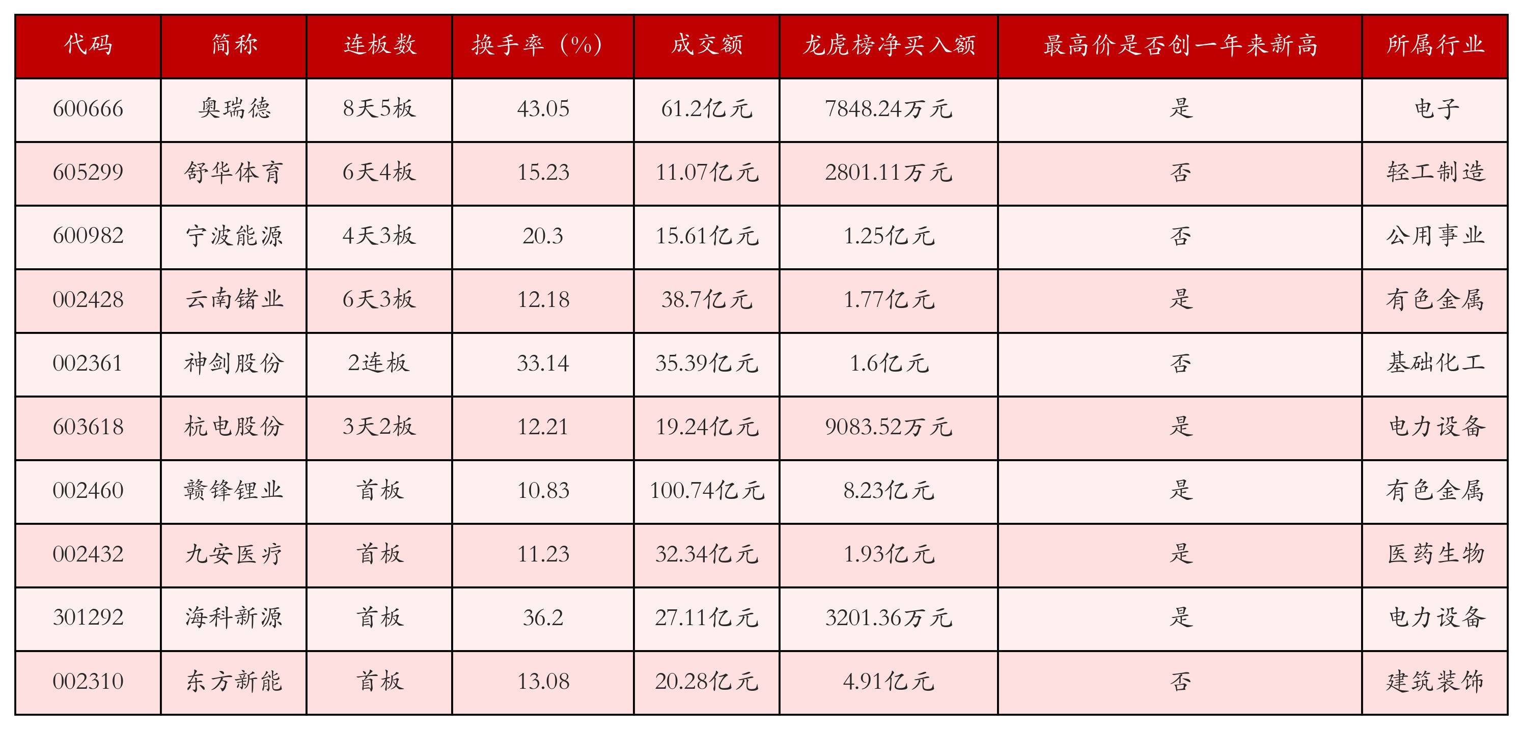 戒指3月27日收盘,上证综指高潮0.63%,收于3913.72点,深证成指高潮1.13%,收于13760.37点,创业板指高潮0.71%,收于3295.88点。本日沪深两市A股缠绵94只涨停,详细面前连板数以及当日龙虎榜数据,其中较为强势的前三只个股分辩为:奥瑞德(600666)、舒华体育(605299)与宁波动力(600982)。本日强势个股前10位具体数据见下表: